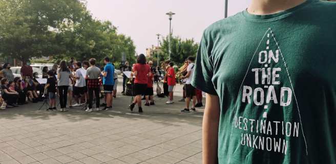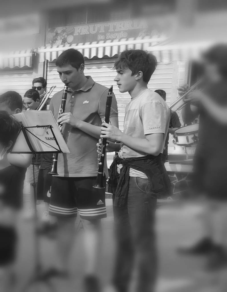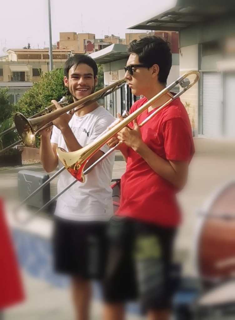Un capannello di persone attorno ad una quindicina di quelli che inequivocabilmente identifichiamo come musicisti. Vari ragazzi con le custodie di trombe, tromboni, sax, clarinetti, tamburi parlottano e sorridono cercando con lo sguardo amici e parenti tra il pubblico. Ci sembra che sia un evento importante per loro e per le persone che attendono con noi il concerto. Ci avviciniamo a Pasquale, musicista ed educatore che coordina il centro aggregativo e la banda, una sorta di faro bonario e autorevole che guida questo gruppo come un allenatore di serie A.