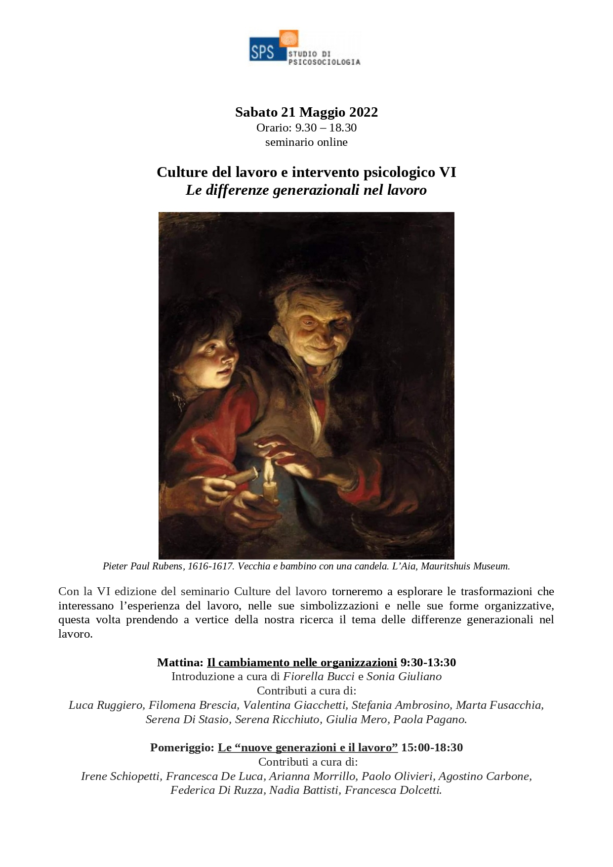 Seminario – Culture del lavoro e intervento psicologico IV. Le differenze generazionali nel lavoro 21 Maggio 2022 ~ pensaremozioni Condividi: Condividi su X (Si apre in una nuova finestra) X Condividi su Facebook (Si apre in una nuova finestra) Facebook Mi piace Caricamento... Correlati Pubblicato da pensaremozioni Vedi tutti gli articoli di pensaremozioni