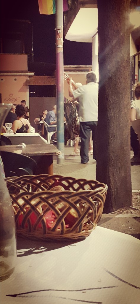 Siamo la piazza partecipe di applausi che giungono da lì vicino, il nipote ci accoglie, la zia prende le nostre ordinazioni.