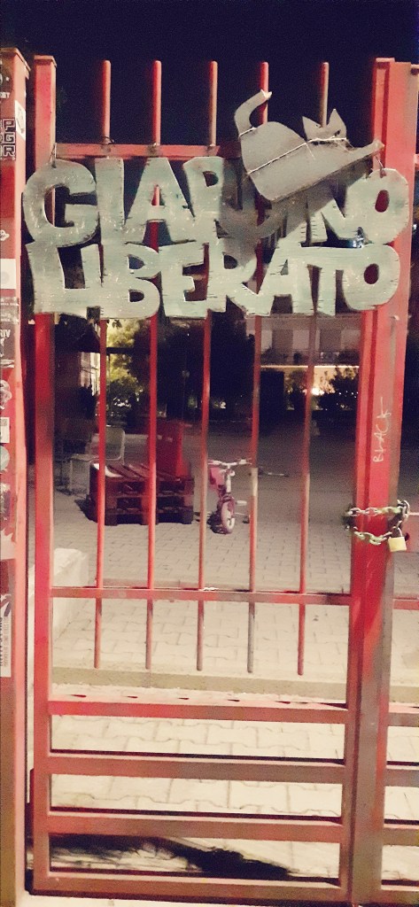Percorriamo una strada parlante e vivace, proprio per questo. Ci tira dentro, ci accoglie, ci invita ad esserci, nella forma che ci diverte assumere, lì, con loro. Quel fuori dal tempo non richiama la pesante nostalgia di un passato perduto, né il timore di un futuro catastrofico, richiama piuttosto il tempo della vita in un contesto che senti che ti appartiene, dove l’abitare va oltre la casa, dove abitare è essere in relazione col verde “che non c’è“, con la piazza “che non c’è” , col giardino “liberato”: luoghi da vivere e da proteggere, recuperati al degrado, a disposizione di una comunità interessata a usarli e capace di manutenerli e tutelarli. Un gran profumo di tigli.