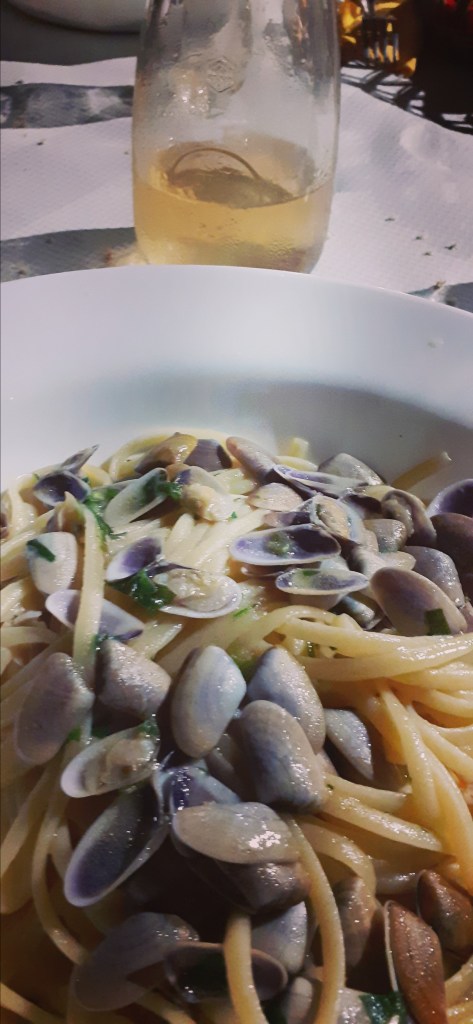 Il locale ci attende, eccolo là, girovagando per le strade, incontrando gente, curiosando dentro e fuori, arriviamo lentamente alla piazza, al tavolo prenotato imbiancato da piccoli fiori bianchi profumati, ai nostri posti.