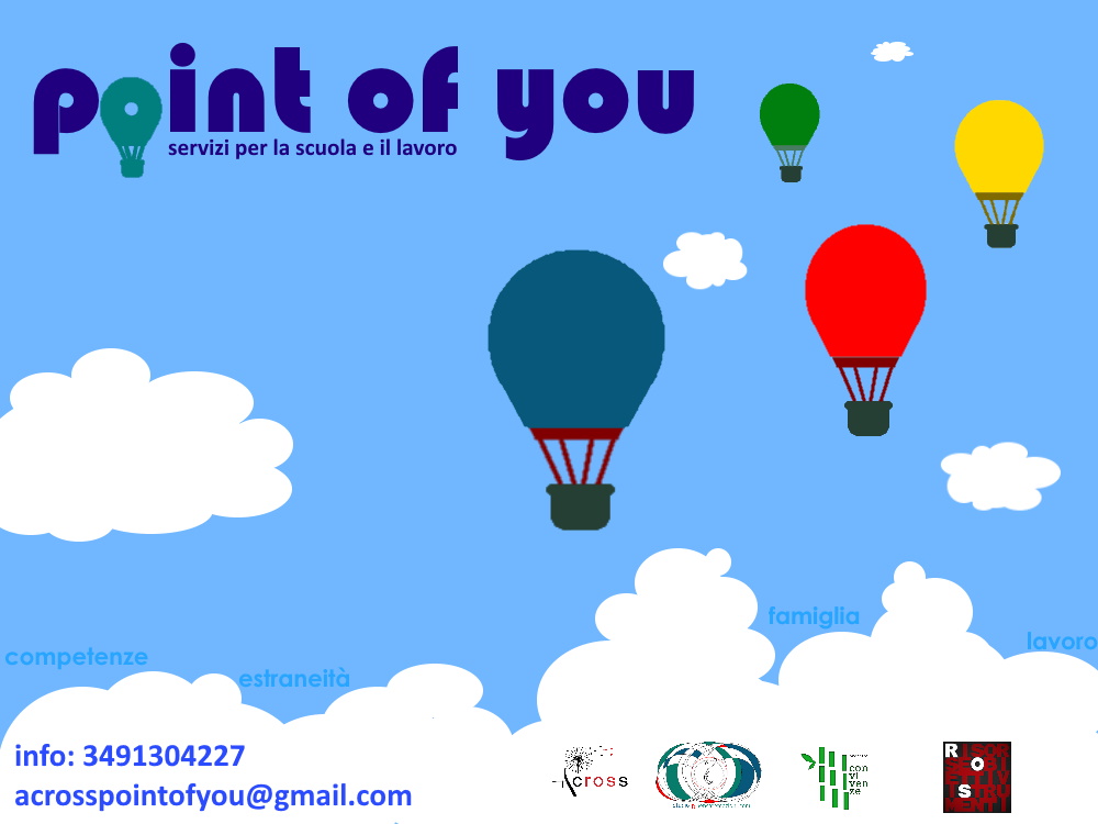 Point of You è un progetto composto da un pool di servizi finalizzati ad ottimizzare le esperienze formative e lavorative di giovani e giovani adulti. E’ rivolto a giovani interessati a orientarsi, pensare scegliere percorsi formativi e lavorativi, famiglie implicate nell’accompagnare i propri figli nelle loro scelte, scuole interessate ad integrare il proprio lavoro e ad investire sullo sviluppo, professionisti interessati a pensare sviluppo per il proprio lavoro e i contesti in cui intervengono